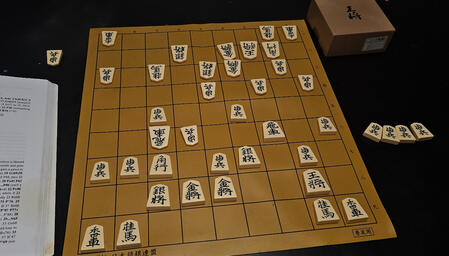 Shogi (将棋) is Japan's equivalent of chess. It is played on a 9x9 board with 40 pieces. Like chess, the goal is to checkmate your opponent's King, but you may also deploy pieces you have captured back onto the board as your own.